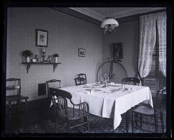 Glass negative showing the interior of the dining room at the Morris family summer home, Avocado, furnished with a table and chairs. A bicycle sits in the corner of the room and a shelf holding various vases, a lamp, and a clock sits on the adjacent wall. Elliston Perot Morris bought property in Sea Girt, N.J. in 1875, where he built the summer home Avocado after designs by Quaker architect Hibberd Yarnall. Morris left Avocado, named after a Perot family estate in Bermuda, to his daughter Elizabeth Canby Morris in his will. It was sold in 1947 after her death. By 1958 the house had been demolished.