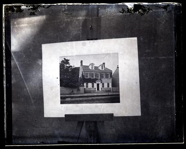 Glass negative showing a photograph mounted and resting on a easel of the Deshler-Morris House at 5442 Germantown Avenue. In the photograph, a boy rides a bicycle down the sidewalk in front of the wooden fence that stands to the left of the house. David Deshler built the original four-room summer cottage on this Germantown lot in 1752, adding the three-story front addition in 1772. The house was sold to Col. Isaac Franks in 1792 after Deshler’s death. President George Washington rented the home for the duration of the yellow fever epidemic of 1793 and the summer of 1794. Elliston and John Perot purchased the house in 1804, selling it to Elliston’s son-in-law Samuel B. Morris after his death in 1834. The house stayed in the possession of the Morris family for over a century, when Elliston P. Morris donated the house to the National Parks Service in 1948. The name was officially changed to the Germantown White House in 2009.
