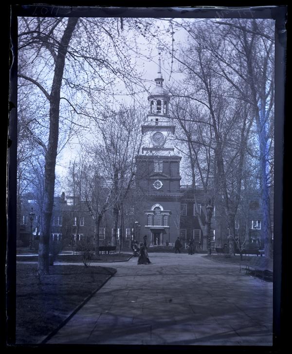 Glass negative showing exterior view of the back of the Independence Hall. A wide path with benches leads through a Independence