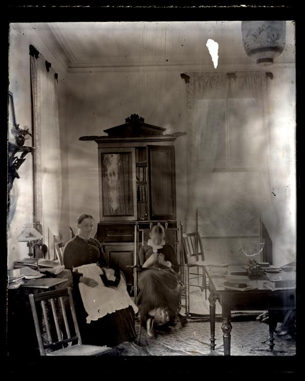 Glass negative showing a view of an interor, possibly at the Morris family home Avocado, with two women sitting in rocking chairs doing handiwork. The room is furninshed with a large secretary, tables, chairs, books, and small knickknacks. Elliston Perot Morris bought property in Sea Girt, N.J. in 1875, where he built the summer home Avocado after designs by Quaker architect Hibberd Yarnall. Morris left Avocado, named after a Perot family estate in Bermuda, to his daughter Elizabeth Canby Morris in his will. It was sold in 1947 after her death. By 1958 the house had been demolished.