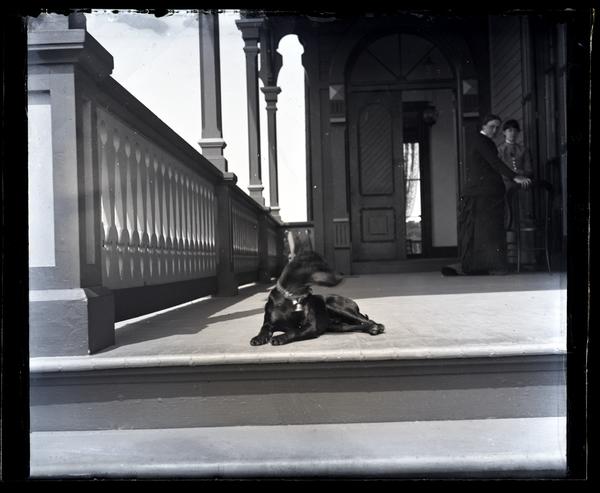 Glass negative showing Jet, a small black dog wearing a collar with a bell resting, on a porch at the Morris family home Avocado. Two women stand in the background next to a chair and in front of a rounded doorway. Elliston Perot Morris bought property in Sea Girt, N.J. in 1875, where he built the summer home Avocado after designs by Quaker architect Hibberd Yarnall. Morris left Avocado, named after a Perot family estate in Bermuda, to his daughter Elizabeth Canby Morris in his will. It was sold in 1947 after her death. By 1958 the house had been demolished.