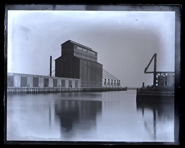 Glass negative showing a large grain elevator in an empty port at Girard Point, Philadelphia. To the right is a dock and to the left is the grain elevator with a sign that reads, "Girard Point Elevators." The International Navigation Company erected a grain elevator on the Girard Point wharves in 1874. Made of brick, iron, and oak, it was damaged by fire in 1881, after which the Girard Point Storage Company bought the property and built two grain elevators.