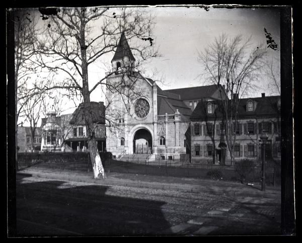 Glass negative showing the Market Square Presbyterian Church (center) and Fromberger-Harkness House (right) from across Market