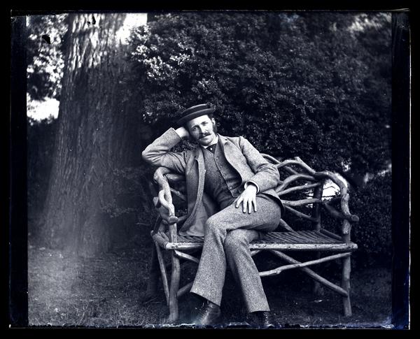 Glass negative showing a man seated on a rustic wooden bench in front of a tree at Sea Girt. The man crosses his legs and rests his head on his hand. He wears a three piece suit, a straw hat, and a pocketwatch.