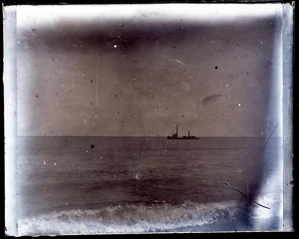 Glass negative showing a ship with a mast and a smokestack at sea. The ship is seen from a distance from the shore. |