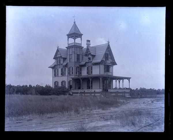 Glass negative showing Avocado, the multi-story Morris family summer home with a prominent spire, wide porch and latticework decoration at Sea Girt, N.J. The house sits among dune grass and other foliage. Marriott C. Morris' sister Elizabeth Canby Morris looks out of a window on the third story. Elliston Perot Morris bought property in Sea Girt, N.J. in 1875, where he built the summer home Avocado after designs by Quaker architect Hibberd Yarnall. Morris left Avocado, named after a Perot family estate in Bermuda, to his daughter Elizabeth Canby Morris in his will. It was sold in 1947 after her death. By 1958 the house had been demolished.