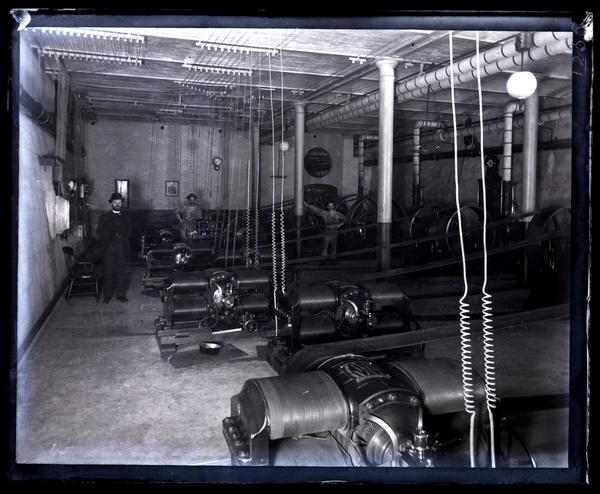 Glass negative showing three men, including plant superintendent Daniel Crosby, standing near rows of equipment responsible for generating electricity for Strawbridge & Clothier's department store. Strawbridge & Clothier began as a dry goods store founded by Justus Clayton Strawbridge (1838-1911) and Isaac Hallowell Clothier (1837-1921) in 1868 in Philadelphia. The engine room was relocated from the store’s basement to its stable on the 800 block of Filbert Street circa 1887. A popular department store, branches were built in Pennsylvania, New Jersey, and Delaware after 1930. Bought by May Department Stores Company in 1996, the stores were rebranded as Macy’s in 2006.