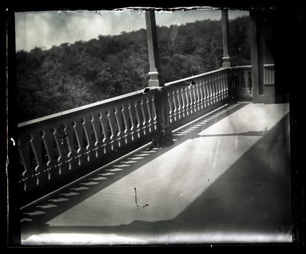 Glass negative showing Jet, a small black dog, sitting next to the railing of a balcony at the Morris family home Avocado. The railing and pillars cast long shadows on the floor and treetops are visible in the distance. Elliston Perot Morris bought property in Sea Girt, N.J. in 1875, where he built the summer home Avocado after designs by Quaker architect Hibberd Yarnall. Morris left Avocado, named after a Perot family estate in Bermuda, to his daughter Elizabeth Canby Morris in his will. It was sold in 1947 after her death. By 1958 the house had been demolished.
