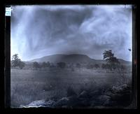 Glass negative showing a view of Pocono Knob seen from across a grassy field. A line of trees stands at the base of the mountain.