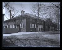 Glass negative showing the Arch Street Meeting House at 320 Arch Street, a large two-story brick building with shuttered windows. A brick sidewalk runs along the front of the building next to a grassy lawn, and a wooden wall is on the left. A Quaker burial ground as early as 1683, the site was officially deeded as a burial ground in 1701. The Meeting House was built by carpenter Owen Biddle Jr. (1774-1806) in 1803-1804, with a second room added in 1811. The Meeting House has continued to host Quaker religious services through the 21st century, with the most recent building renovations adding second-floor conference rooms in 1969. Cemetery burials officially ended in 1880.