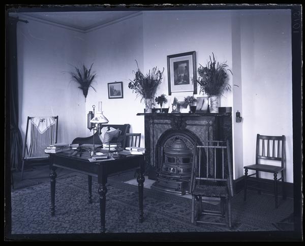 Glass negative showing the richly decorated library interior at the Morris famliy home Avocado. There is a fireplace on the right wall with plants, a clock and a picture of a sailboat on the mantle. A round metal stove sits in the grate. Various chairs and a table full of books sits on a rug with an intricate floral pattern. Elliston Perot Morris bought property in Sea Girt, N.J. in 1875, where he built the summer home Avocado after designs by Quaker architect Hibberd Yarnall. Morris left Avocado, named after a Perot family estate in Bermuda, to his daughter Elizabeth Canby Morris in his will. It was sold in 1947 after her death. By 1958 the house had been demolished.