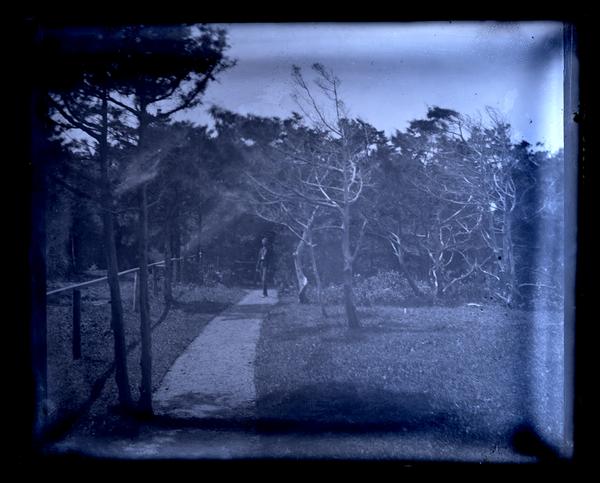 Glass negative showing a dirt road curving slightly to the left and lined with trees, probably in the yard at the Morris family home, Avocado. A man stands in the road near the wooden fence that runs along the left side.