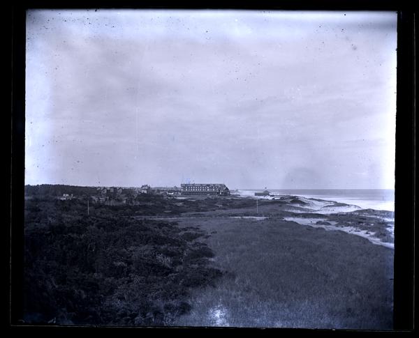 Glass negative showing a large building, possibly Tremont House, seen from across a field of dune grass. The ocean is visible on the right and other smaller buildings on the left. The Tremont House hotel was opened between 1878 and 1880 by Paul and Mary Thurlow.