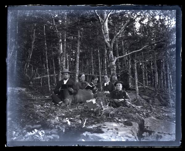 Glass negative showing Marrott C. Morris' parents Elliston P. Morris and Martha Canby Morris, and brother Samuel Buckley Morris, with Ann Emlen and Mary Emlen seated on the ground among trees and other foliage on Overlook Mountain. Martha Morris holds a book and Elliston Morris holds a sketchbook and pen. The women wear long dresses and the men wear three-piece suits and hats.