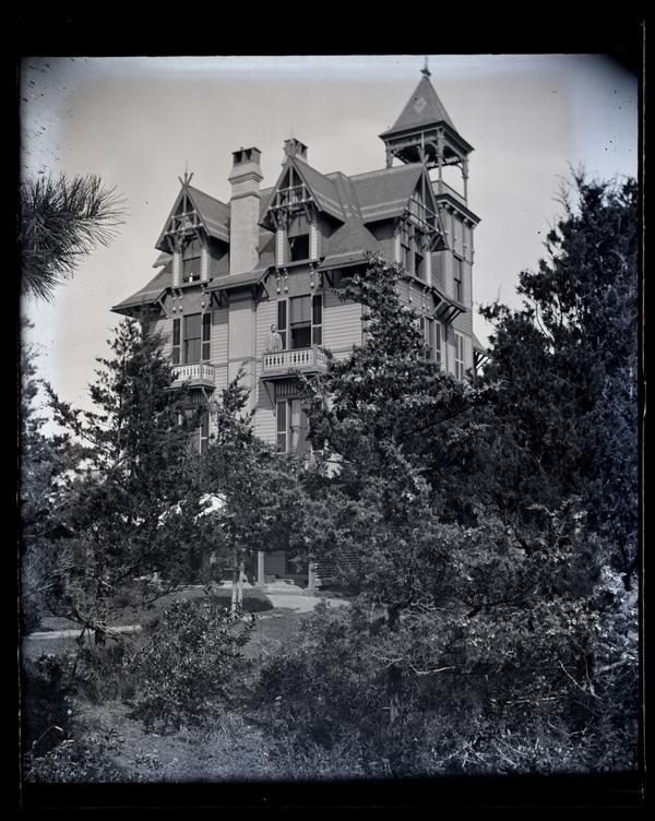 Glass negative showing the upper portion of the Morris family home Avocado, featuring a tower with a balcony and gables decorated with tracery. The lower portion of the house is obscured by trees and other foliage. A man, possibly Marriott C. Morris' father Elliston P. Morris, stands at a second-story balcony. Elliston Perot Morris bought property in Sea Girt, N.J. in 1875, where he built the summer home Avocado after designs by Quaker architect Hibberd Yarnall. Morris left Avocado, named after a Perot family estate in Bermuda, to his daughter Elizabeth Canby Morris in his will. It was sold in 1947 after her death. By 1958 the house had been demolished.