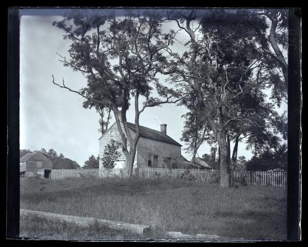 Glass negative showing a two-story wooden house with a shed to the left and fence running across the field at Sea Girt. Trees surround the home on either side of the fence.