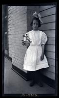 Film negative showing Marriott C. Morris' first cousin once removed Nancy Morris as a girl standing on the porch at the Morris family home Avocado. She wears a white dress with a large bow in her hair and holds a toy boat in her right hand. Elliston Perot Morris bought property in Sea Girt, N.J. in 1875, where he built the summer home Avocado after designs by Quaker architect Hibberd Yarnall. Morris left Avocado, named after a Perot family estate in Bermuda, to his daughter Elizabeth Canby Morris in his will. It was sold in 1947 after her death. By 1958 the house had been demolished.