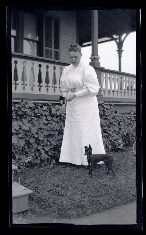 Film negative showing a woman, possibly Marriott C. Morris' sister Elizabeth Canby Morris, standing in the grass next to a porch of the Morris family home Avocado. She wears a long white dress and holds flowers in her left hand. A small black black dog stands next to her and bicycles rest against the porch behind her. Elliston Perot Morris bought property in Sea Girt, N.J. in 1875, where he built the summer home Avocado after designs by Quaker architect Hibberd Yarnall. Morris left Avocado, named after a Perot family estate in Bermuda, to his daughter Elizabeth Canby Morris in his will. It was sold in 1947 after her death. By 1958 the house had been demolished.