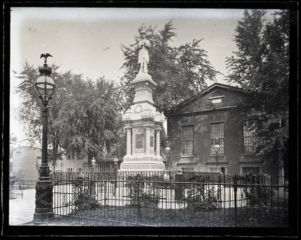 Glass negative showing the Civil War monument in Market Square, comprised of a sculpture of a soldier set on a tall, carved pedestal. The monument is set in a square surrounded by a low metal fence. A lamppost stands to the left at the entrance to the square. First called The Green, Market Square was established from land originally owned by James De la Plaine as early as 1703. As a center of community activity, Market Square contained not only market stalls but also the prison and stocks. Samuel B. Morris planted many of the Square’s original trees. Prominent buildings situated around the Square include the Deshler-Morris House, the German Reformed Church, and the Fromberger-Harkness House. The Market Square monument, built in 1883, commemorates the contributions of soldiers to the Civil War. Designed as a Union soldier, it rests on a pedestal made from granite taken from Devil’s Den, Gettysburg. The fence surrounding the monument was constructed from old musket barrels and bayonets. Cannons used during the war stand beside the monument.
