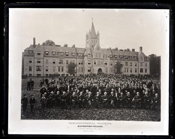 Glass negative showing a framed photograph of a large group posed in front of Barclay Hall, the brick residential hall with a prominent central spire at Haverford College. The caption below the image reads, "Semi-Centennial Re-Union, Haverford College, Tenth Month 27th 1883, - Barclay Hall." Barclay Hall was built in 1877 to expand the living quarters of the college, originally founded in 1833.