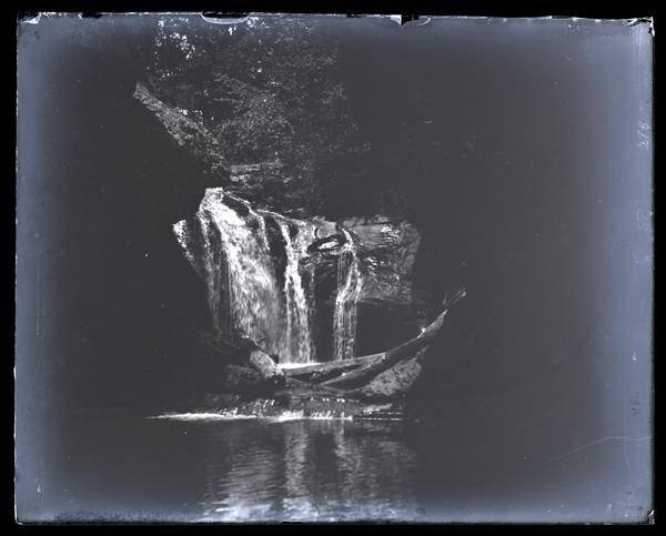 Glass negative showing Marshall's Falls, a waterfall flowing into a lake.