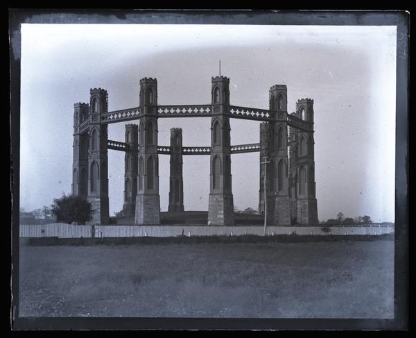 Glass negative showing the gasometer of the Philadelphia Gas Works surrounded by a low fence and seen from across a field. The gasometer consists of ten crenellated columns standing around a circular base and connected by a band decorated with quatrefoil shapes. Philadelphia Gas Works began operating in 1836 when gas lights were installed along Second Street. It came under city ownership in 1841.