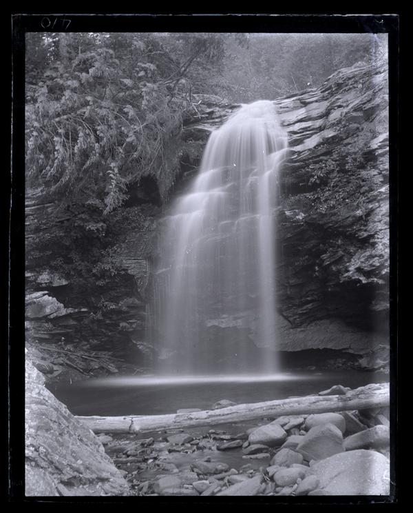 Glass negative showing a waterfall in Plattekill Clove cascading into a pool from a high, rocky hillside. Foliage lines the hill on either side of the falls.