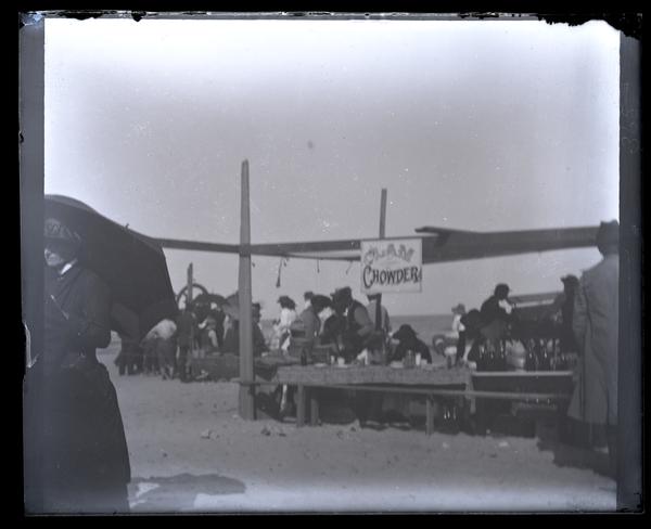 Glass negative showing a covered stand filled with people on Ocean Day. The sign above the stand reads, "Clam Chowder." A woman holding a parasol walks out of the photograph frame to the left. Jersey Wash Day, also known as Salt Water Day or Ocean Day, was an annual event held the second Saturday of August near Wreck Pond in Sea Girt. Farmers living twenty to thirty miles from Sea Girt came to the sea to spend a day bathing and celebrating. The tradition, begun before 1853, stopped around the 1930s.