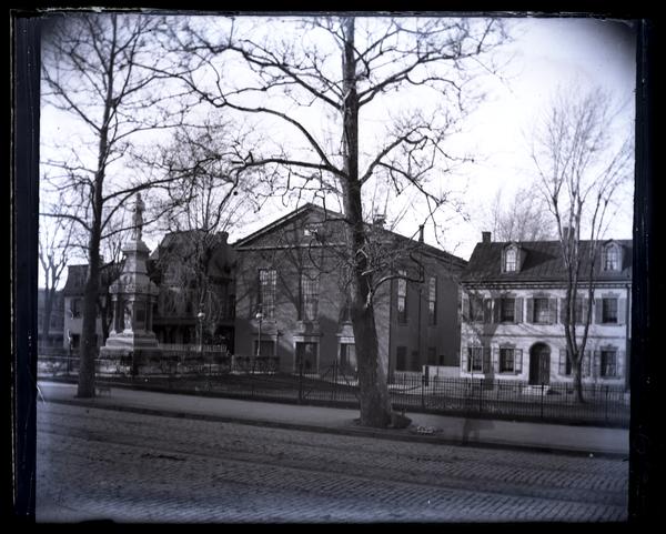 Glass negative showing the Market Square Presbyterian Church and Fromberger-Harkness House from across Market Square. A brick road with trolley tracks runs down the center. A sidewalk and the square bordered by a metal fence separate the buildings from the road. The Civil Ware monument, consisting of a statue of a man standing on a carved pedestal, stands in the square to the left. First called The Green, Market Square was established from land originally owned by James De la Plaine as early as 1703. As a center of community activity, Market Square contained not only market stalls but also the prison and stocks. Samuel B. Morris planted many of the Square’s original trees. Prominent buildings situated around the Square include the Deshler-Morris House and the German Reformed Church. The Market Square monument, built in 1883, commemorates the contributions of soldiers to the Civil War. Designed as a Union soldier, it rests on a pedestal made from granite taken from Devil’s Den, Gettysburg. The fence surrounding the monument was constructed from old musket barrels and bayonets. Cannons used during the war stand beside the monument. Named for John Fromberger and Mary Warden Harkness, the Fromberger-Harkness House was built as late as 1795. It was occupied variously by St. Luke’s Protestant Episcopal Church (1813-1837), the Young Women’s Christian Association of Germantown (1873-1915), Mary Warden Harkness Boarding Home for Girls (1917-1941), the Germantown Fire Insurance Company (1954-1964), and the Germantown Insurance Co. (1964). Originally built as a Dutch Reformed Church circa 1710, the Market Square Presbyterian Church became a German Reformed Church by 1732. The building was razed and rebuilt in 1838-1839, and then enlarged in 1857. The congregation, led by pastor Jacob Helffenstein, withdrew from the Reformed Church in 1855 and became Presbyterian in 1858. In 1888, the church was rebuilt after the designs of architect George T. Pearson.