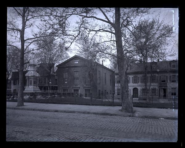 Glass negative showing the Market Square Presbyterian Church across Germantown Avenue and Market Square taken from the front
