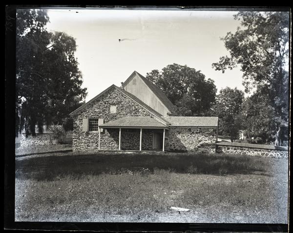 Glass negative showing the side facade of the Radnor Meeting House, a one-story stone building with two covered entryways. A low stone wall extends to the right and other smaller buildings are visible to the left. The Radnor Meeting began in 1684 in the house of Quaker minister John Jerman. The Meeting House was built in two sections, the first in 1717 and the second in 1722 on land owned by Jerman. He transferred ownership to the Meeting in 1735. The Meeting House was used as a hospital for the Continental Army in 1778. Due to dwindling numbers, the meeting closed in 1882, but was reopened in 1937.