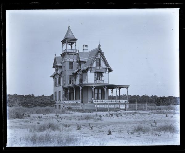 Glass negative showing the Morris family home Avocado, a multi-story Victorian-style home with a wide porch and a prominent tower. Marriott C. Morris' mother Martha Canby Morris is visible sitting in a window on the second floor. Dune grass grows in front of the house and trees behind. Elliston Perot Morris bought property in Sea Girt, N.J. in 1875, where he built the summer home Avocado after designs by Quaker architect Hibberd Yarnall. Morris left Avocado, named after a Perot family estate in Bermuda, to his daughter Elizabeth Canby Morris in his will. It was sold in 1947 after her death. By 1958 the house had been demolished.