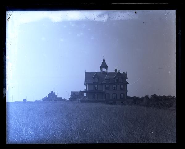 Glass negative showing the multi-story Morris family home, Avocado, seen from across a field of dune grass. The house has a wide porch, a tower with a balcony, and tracery decorating the gables. Other buildings are visible in the distance on the right. Elliston Perot Morris bought property in Sea Girt, N.J. in 1875, where he built the summer home Avocado after designs by Quaker architect Hibberd Yarnall. Morris left Avocado, named after a Perot family estate in Bermuda, to his daughter Elizabeth Canby Morris in his will. It was sold in 1947 after her death. By 1958 the house had been demolished.