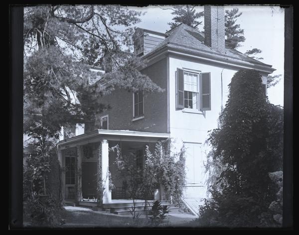 Glass negative showing the old Wister House, a two-story house with a porch and shuttered windows surrounded by trees.