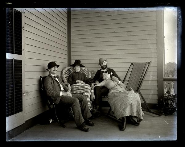 Glass negative showing Will and Florence Collins, Sam Rhorer, and Marriott C. Morris' sister Elizabeth Canby Morris seated on a porch at the Morris family home Avocado. The women wear long, patterned dresses and the men wear three piece suits and hats. Florence Collins on the right leans against Will Collins sitting behind her. Elliston Perot Morris bought property in Sea Girt, N.J. in 1875, where he built the summer home Avocado after designs by Quaker architect Hibberd Yarnall. Morris left Avocado, named after a Perot family estate in Bermuda, to his daughter Elizabeth Canby Morris in his will. It was sold in 1947 after her death. By 1958 the house had been demolished.