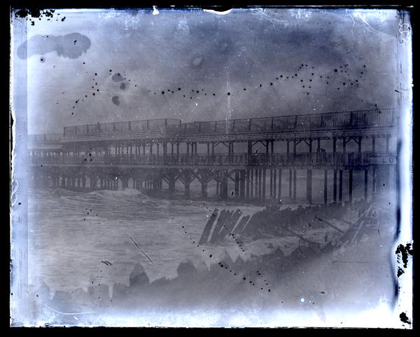 Glass negative showing Applegate's Pier at Atlantic City, a long two-story wooden pier extending into the ocean as waves break near the shore. People walk on the pier.