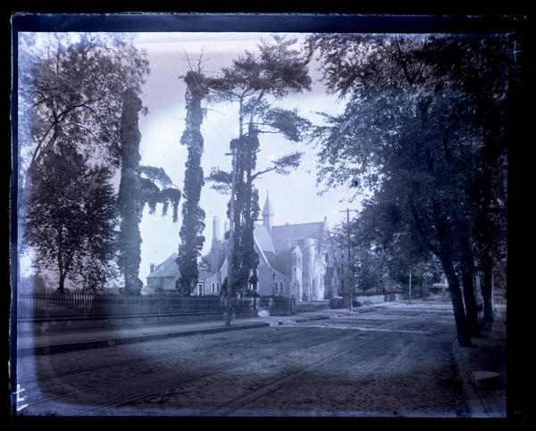 Glass negative showing Wakefield Church on the left side of Germantown Avenue, a cobblestone road with trolley tracks. A cemetery is next to the church, surrounded by a metal fence. Tall trees line the road and the churchyard. The Wakefield Presbyterian Church was built in 1873 with a bequest of land from church member William Adamson. The church originally started as a Sunday School in 1856. When the congregation grew, a new stone church building was built in 1882.