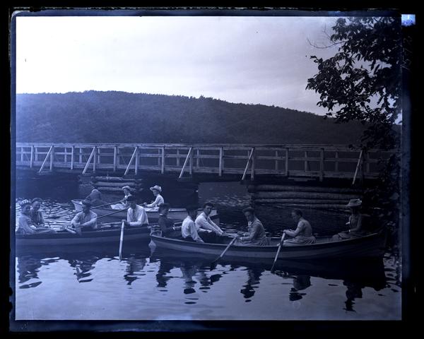 Glass negative showing three rowboats, each carrying a group of people, floaing on Lake Hopatcong. The boats travel next to a wooden bridge, and their reflections are mirrored in the calm water. Lake Hopatcong, the largest freshwater body in New Jersey, became a popular resort destination after rail service came to the area in 1882. By the 1940s and 1950s, it had become mostly residential.