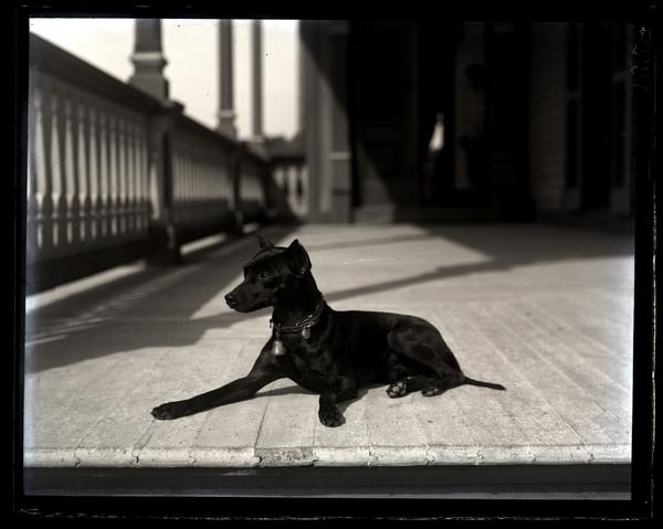 Glass negative showing Jet, a small black dog, resting on the porch at the Morris family home Avocado. Jet wears a collar with a bell and lays in the sunlight. Elliston Perot Morris bought property in Sea Girt, N.J. in 1875, where he built the summer home Avocado after designs by Quaker architect Hibberd Yarnall. Morris left Avocado, named after a Perot family estate in Bermuda, to his daughter Elizabeth Canby Morris in his will. It was sold in 1947 after her death. By 1958 the house had been demolished.