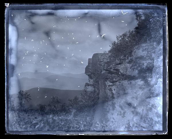 Glass negative showing a jagged cliff face on Overlook Mountain with rolling hills in the distance.
