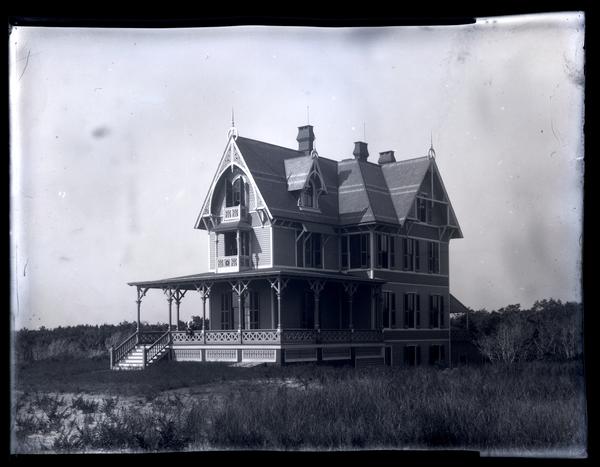 Film negative showing a view Cedar Mer the Morris family's three-story house with a wide porch and balconies on the second and third floors. The railings on the porch and the balconies have a criss-cross pattern. Grass grows in front of the house and trees grow behind it. Quaker architect Hibberd Yarnall built the summer home Cedar Mer around 1875. After his death in 1882, Elliston Perot Morris bought the property. Morris left Cedar Mer to his son Marriott Canby Morris in his will. It was sold in 1951 after his death. By 1958 the house had been demolished.