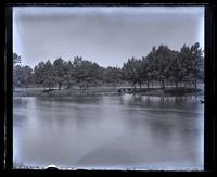 Glass negative showing Sunset Lake interspersed with various islands at Asbury Park, N.J. A canoe holding a group of people is moored at the island on the right. Asbury Park was developed in 1871 as a residential resort by James A. Bradley (1830-1921), a New York brush manufacturer. The town was named for Francis Asbury (1745-1816), the first American bishop of the Methodist Episcopal Church. It was once home to the famous indoor amusement park Palace Amusements, the site of the original Tillie mural depicting two grinning faces.