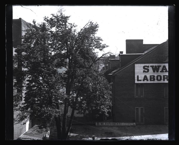 Glass negative showing the side of Swaim's Laboratory on the 600 block of Chestnut Street. Half the sign is visible and a large tree stands to the left of the buliding.