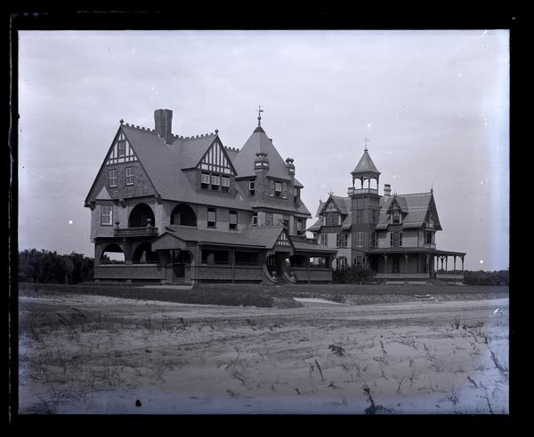 Glass negative showing Morris family home Avocado and the house of Charles and Phoebe Wright, two multi-story houses with grassy lawns standing in front of a sand dune. Avocado on the right has a wide porch and a tower with a balcony. The Wright's house on the left is made of brick and features a porch and a crenellated ridgeline. Elliston Perot Morris bought property in Sea Girt, N.J. in 1875, where he built the summer home Avocado after designs by Quaker architect Hibberd Yarnall. Morris left Avocado, named after a Perot family estate in Bermuda, to his daughter Elizabeth Canby Morris in his will. It was sold in 1947 after her death. By 1958 the house had been demolished. Charles Wright began the construction of this house in 1885. Phoebe Wright was not directly related to him, but lived here until the construction of her own house in 1890.