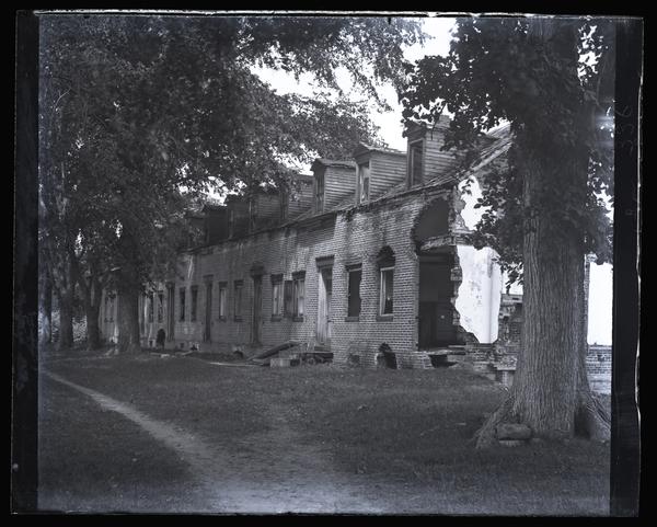 Glass negative showing a row of brick workmen's houses at the former Howell Iron Works at Allaire, N.J. A path and row of trees run in front of the houses. The furthest house on the right has a large hole in the front wall. James P. Allaire (1785-1858) founded the Allaire Iron Works Company (later Howell Iron Works) in 1815. Allaire, New Jersey became a factory town for the company that built engines for steamboats circa 1824. The row homes for workers were completed in 1833, the blast furnace was made in 1831, and the Episcopalian church was built 1832-1836. Financial difficulties and discovery of iron ore deposits in Pennsylvania closed the Company in 1850. In 1957, the land was bought by Allaire Village Inc. and turned into a historic village.