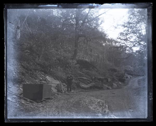 Glass negative showing a path winding through the woods at Plattekill Mountain. A steep hillside rises on the left. A man, possibly Marriott C. Morris' father Elliston P. morris, stands on the path next to a box, barrel, and other debris.