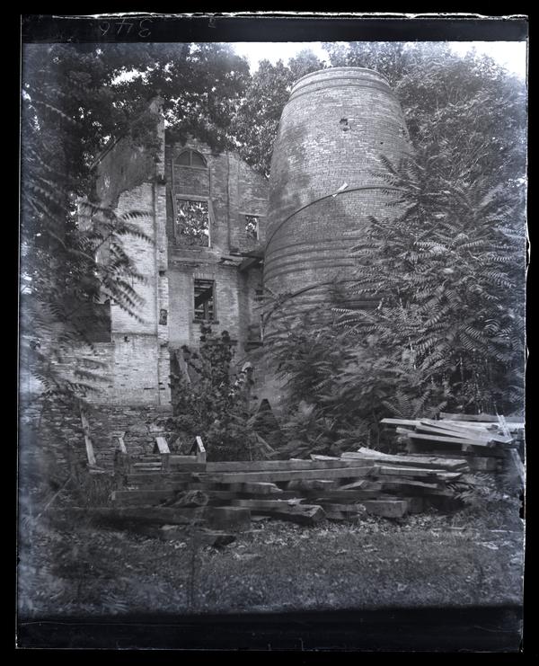 Glass negative showing the blast Furnace at the former Howell Iron Works at Allaire, N.J., a large brick building with a tall circular tower. The building is surrounded by trees and has wooden beams piled in front of it. James P. Allaire (1785-1858) founded the Allaire Iron Works Company (later Howell Iron Works) in 1815. Allaire, New Jersey became a factory town for the company that built engines for steamboats circa 1824. The row homes for workers were completed in 1833, the blast furnace was made in 1831, and the Episcopalian church was built 1832-1836. Financial difficulties and discovery of iron ore deposits in Pennsylvania closed the Company in 1850. In 1957, the land was bought by Allaire Village Inc. and turned into a historic village.