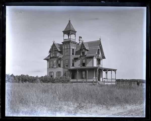Glass negative showing the Morris family home Avocado, a multi-story Victorian style home with a wide porch and a prominent spire. The porch and spire are decorated with scrolling latticework. Marriott C. Morris' father Elliston P. Morris stands at the right among the dune grass growing in front of the house. Elliston Perot Morris bought property in Sea Girt, N.J. in 1875, where he built the summer home Avocado after designs by Quaker architect Hibberd Yarnall. Morris left Avocado, named after a Perot family estate in Bermuda, to his daughter Elizabeth Canby Morris in his will. It was sold in 1947 after her death. By 1958 the house had been demolished.