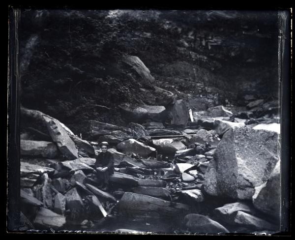 Glass negative showing Marriott C. Morris' brother Samuel Buckley Morris sitting on a series of large rocks covering a streambed below Haines Falls. Trees grow on the slope behind the stream.