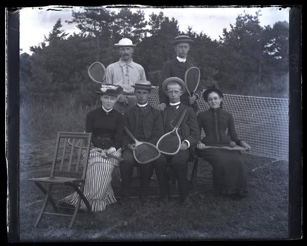 Glass negative showing a group portrait of Marriott C. Morris, his sister Elizabeth Canby Morris, and his third cousins Israel Morris, Richard Jones Morris, and William Morris, with Miss S. Evans. The group all hold tennis racquets. The women wear long dreses and hats. The men besides Marriott Morris wear three-piece suits, and all the men wear hats. The tennis net is visible behind the group to the right and an empty chair sits in the foreground.